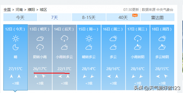 最后,我们再简单聊一下气温。预计豫北地区的濮阳,安阳,鹤壁,新乡等地气温有明显波动。比如濮阳13日最高气温26℃,到了14日最高气温仅有22℃左右。