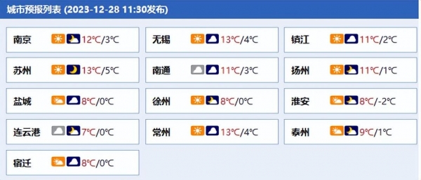 省会南京市,今天29号是多云还有小雨,温度在4℃~12℃左右;明天30号的天气将由多云逐渐转为晴天,温度在1℃~16℃左右;后天31号将迎来是晴朗天气,温度在0℃~9℃左右。从下图预报中看到,未来三天南京最低温度将逐渐达到0℃,大风风力也会维持在4级左右,因此大家早晚还是要多注意防寒保暖。
