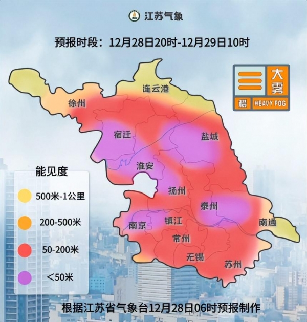 最近几天,江苏地区迎来了大范围的大雾天气,早上一出门,映入眼帘的都是一片灰蒙蒙的景象。像长江周边及以北大部分地区都出现了浓雾或强浓雾,甚至有些地方出现了特强浓雾。徐州、连云港、宿迁、淮安、盐城、扬州、南通、苏州等地的部分区域还发布了大雾红色预警信号。