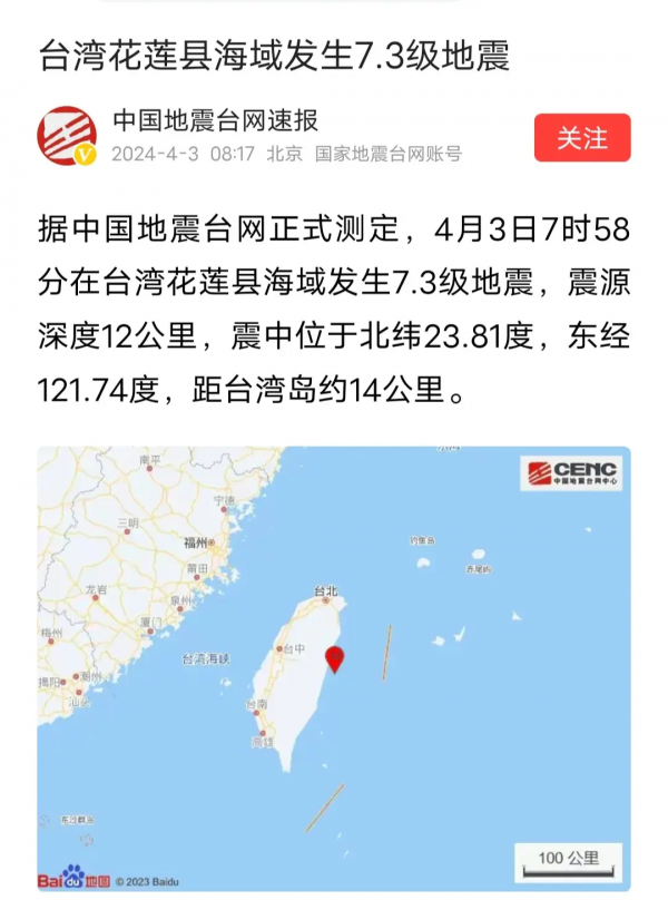 突发大新闻,就在刚刚。4月3日7时58分在台湾花莲县海域发生7.3级地震,震源深度12千米,震中距离台湾岛东岸约20公里。地震发生后,台湾多地出现晃动。