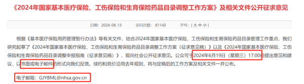 国家医保局官网提到,公众可以在明天下班前,2024年6月19日(星期三)17:00前,以书面或电子邮件的形式提出意见和建议,列出了电子邮箱地址 [1] 。