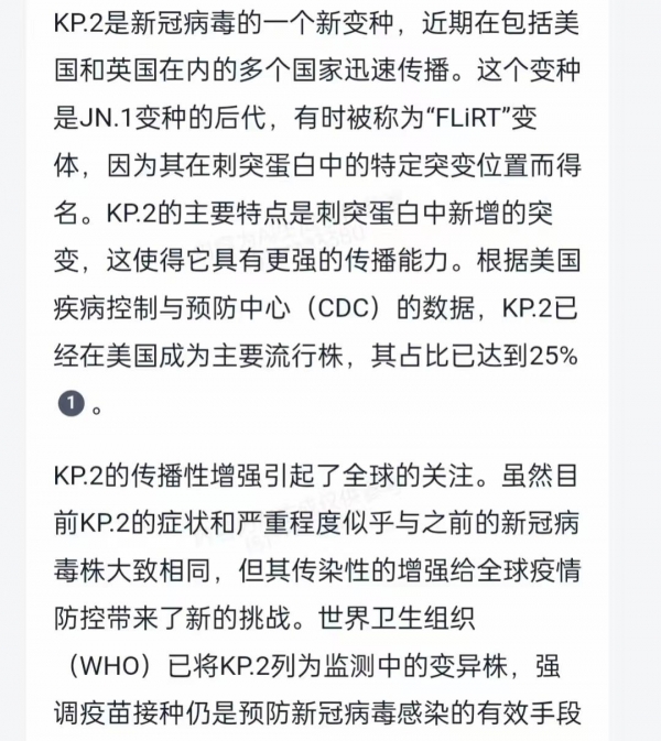 专家介绍,KP.2是新冠病毒的一个新变种,这种新毒株更具传染性,它对细胞的粘性很强,在空气中传播,这就说明这个毒株在人群中传播的会非常快,要想控制住可能会比之前的防控更加困难。