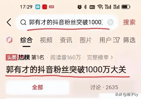 5月9日,郭有才在抖音直播唱歌"一夜成名"后,其火爆程度就像一把火一样在网络世界蓬勃延烧。观众数暴涨,粉丝数节节攀升,现在更是突破1000万大关,成为抖音平台新晋"千万大户"!