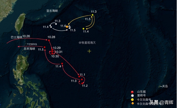 而且从示意图中,我们能够感觉到,山东号航空母舰在进行训练的同时,时刻监视着美国的两支航空母舰的动向。11月的3号,美国的里根号和卡尔文森号都进行了向西的航行,有慢慢靠近我国台岛的趋势。而在同一个时间段,正在更是远处的西太平洋活动的山东号航空母舰也开始了迅速的回防,从3号到5号,直接返回到了吕宋海峡以东海域。今日头条青辉原创,全网同步,搬运必究。
