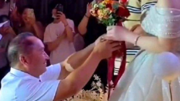 但是新娘却显得淡定多了,新郎手捧鲜花单膝跪地,新娘果断地接过鲜花并且送上了一个大大的拥抱,两人的眼里全是对方、脸上全是幸福。