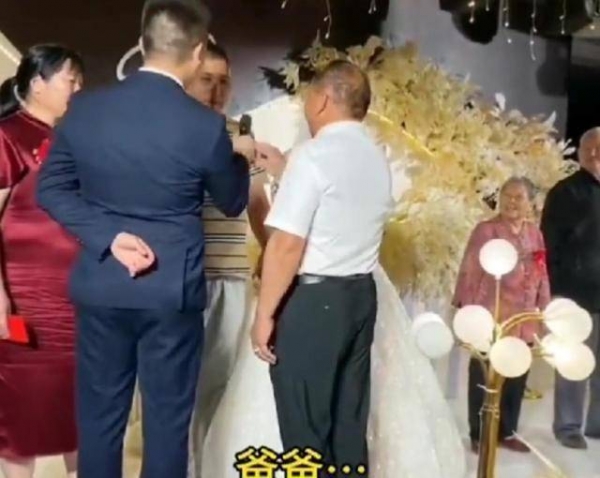 从画面中可以看到,新郎虽然打扮成成功人士的模样,白衬衫红领结看起来特别正式,但依然难以掩盖住他日趋稀少的发型,噌亮的额头显得格外耀眼,站在岳父面前改口的时候,岳父反而显得更加年轻高大。