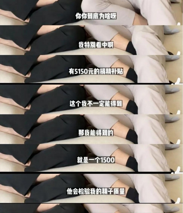 这下子大道理开始了,男友将事情升华到自己在为国家做贡献,好吧,毕竟现在国家鼓励生育,这也说得过去,接下来画风就变了,两个人开始讨论捐精补贴。原来捐精首先都有一个1500的体检,最终可以拿到四到五千元的报酬,两个人美其名曰去免费捐精,不过是奔着免费体检,相当于做了孕前体检。