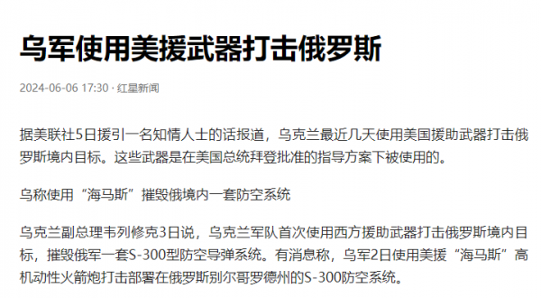 就在这则消息发出之后,6月3日,有消息称乌克兰使用美援"海马斯"高机动性火箭炮打击部署在俄罗斯别尔哥罗德州的S-300防空系统,随后乌克兰副总理证实了该消息。