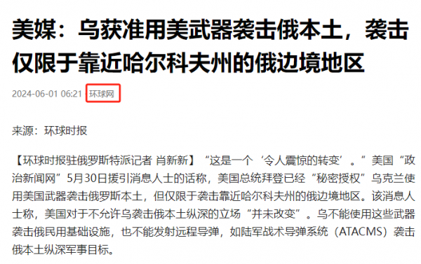 环球网:美媒:乌获准用美武器袭击俄本土,袭击仅限于靠近哈尔科夫州的俄边境地区