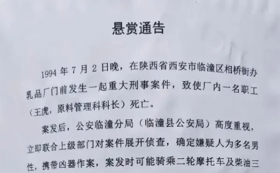 4月9日,陕西省西安市公安局临潼分局刑事侦查大队发布一则悬赏通告,通告称,1994年西安临潼相桥街办乳品厂职工王虎遇害身亡,经侦查确定嫌疑人为多名男性,可能骑乘二轮摩托车及柴油三轮车到达或逃离现场,但到现在也没锁定嫌疑人,也没有相关线索!