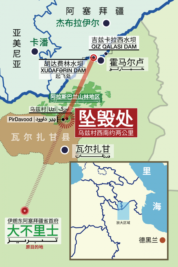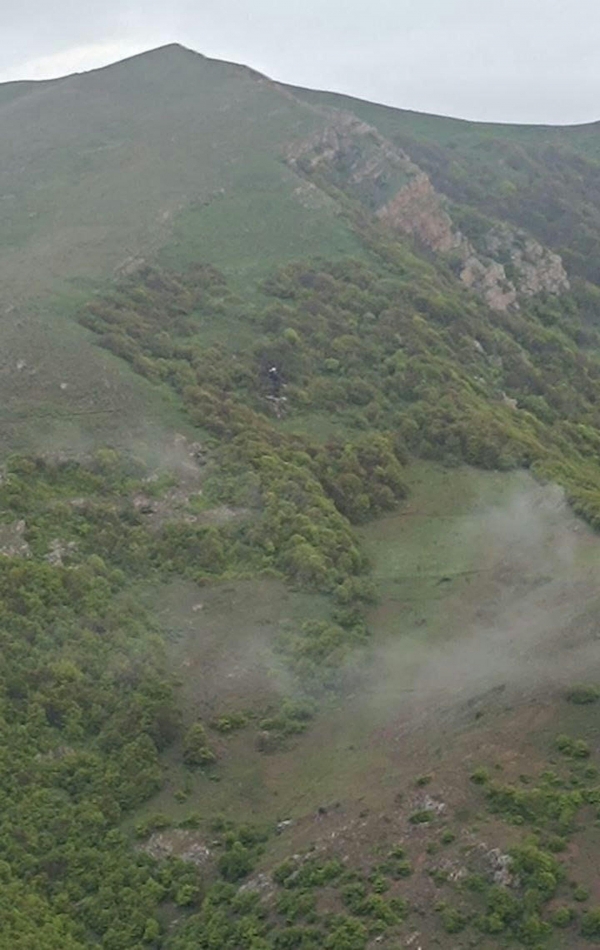 之后消息多次反转,其中在5月19日深夜时最普遍的说法是莱希总统座机遭遇了"硬着陆",已经与伊朗军方通话,机上人员有人受伤,但莱希总统没有生命危险。然而本应按图索骥搜救的人员却没有传来好消息,甚至阿塞拜疆与伊朗和土耳其都出动了搜救力量,最终还是土耳其的无人机利用热成像摄像头发现了坠毁在伊朗东阿塞拜疆省瓦尔扎甘北部近卡莱巴尔的迪兹玛森林附近的山区,此处地形险要,坠毁地是一片灌木丛,莱希总统的座机除了尾部还能看出形状外,机身主要位置已经解体。