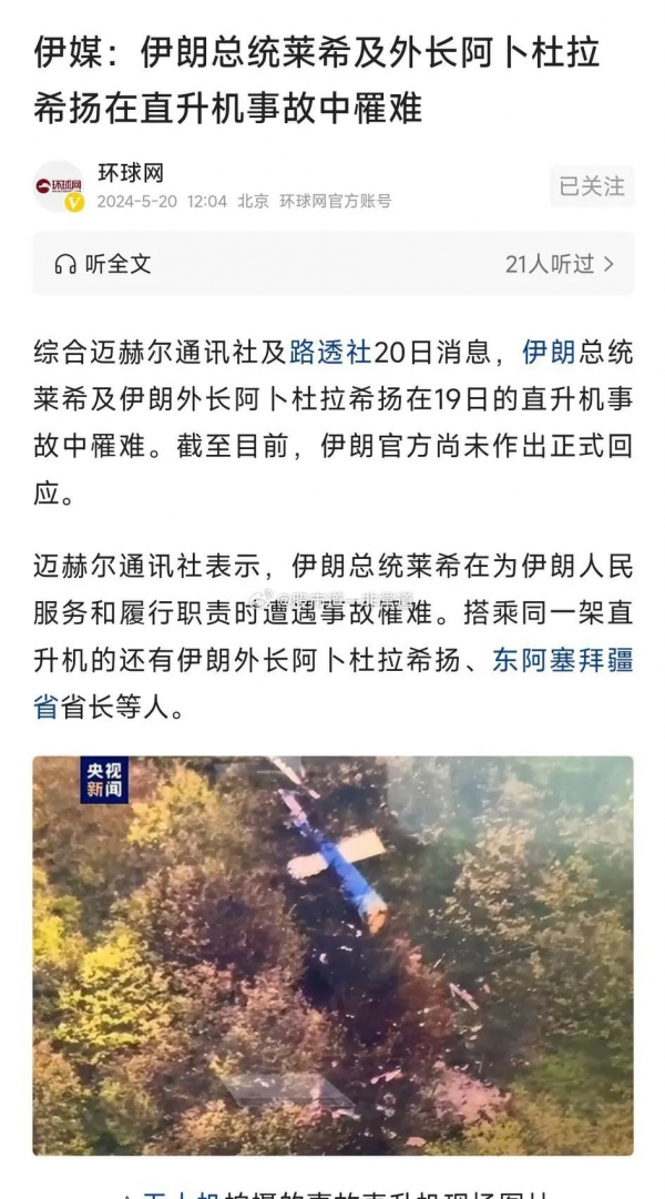伊朗总统莱希坠机事故扑朔迷离,期间多次反转,但最终还是未能传来好消息!最早报道莱希座机遭遇"事故"的是据伊朗国家电视台,5月19日21点左右报道称,载有伊朗总统易卜拉欣·莱希的一架直升机遭遇"硬着陆",并补充说救援队正在前往现场。