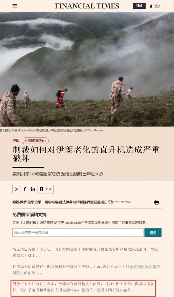 美国的封锁对于伊朗的西方装备维护与更是异常灾难,像贝尔212这种直升机原本不应该用在伊朗总统的座机上,这种在30多年前就已经生产的直升机并不适合在复杂气象条件下飞行,而这次事故则很有可能是因为美国封锁无法完成升级或者没有得到很好的维护造成的。英媒认为美国的封锁肯定是脱不了干系的。