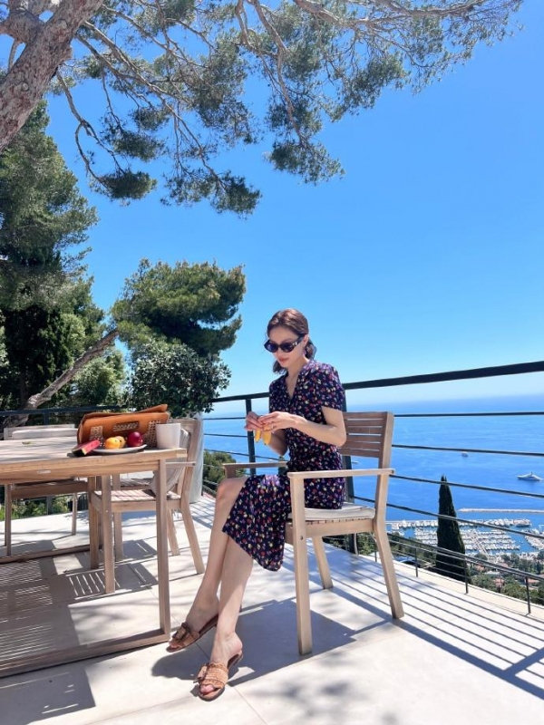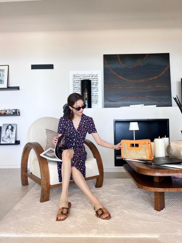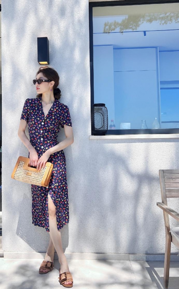 碎花是夏日里不可或缺的元素,它代表了生机与活力,与法式风格的浪漫相结合,营造出一种轻松愉悦的氛围。裙装采取V领的设计也是法式时尚的经典元素之一,它不仅能够拉长颈部线条,还能展现女性的锁骨之美,增添一丝性感而不失优雅的韵味。收腰设计能够突显腰线,塑造出完美的身材比例,无论是在正式场合还是休闲聚会,都能让穿着者成为焦点。裙摆的开叉设计既保留了裙子的端庄,又在行走间透露出一丝不经意的性感,增加了裙子的动态美。