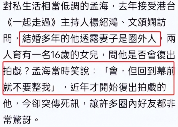 在感情方面,孟海也相当低调。他曾与美籍女星罗芙洛有过一段感情,当时已经到了谈婚论嫁的阶段,但因为他并不想跟随女方去美国生活,因此选择了分手。