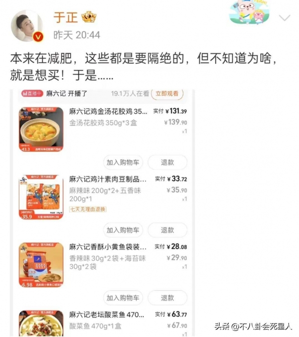 因为大S与汪小菲的事件,张兰一边直播一边爆料,麻六记赚得盆满钵满。于正当然不会错过这么大的热点事件,发文称本来想减肥,但不知道为啥,还是想买,并晒出下单截图。