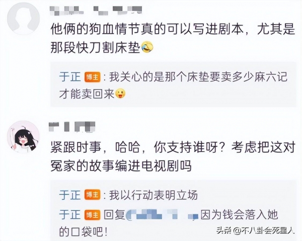 不仅如此,于正还调侃,"那个床垫要多少麻六记才能买回来",他的这番操作,成功蹭到热点,吸引了无数网友的围观。用行动表明立场,力挺张兰汪小菲,收获了很多人的支持。