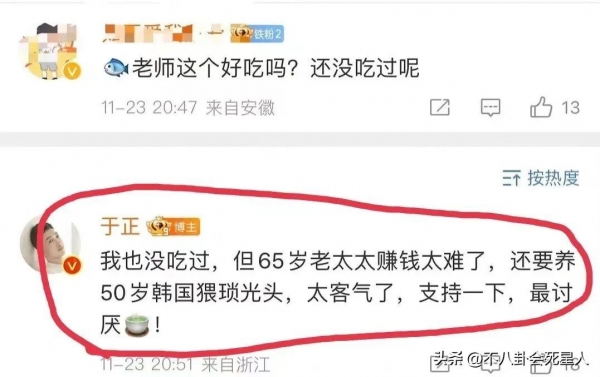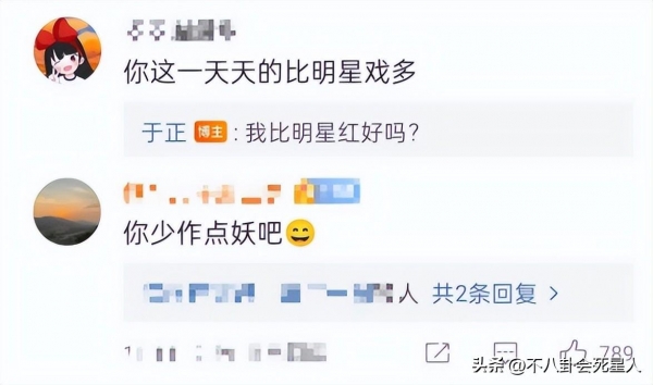基本上,哪里有舆论,哪里就有于正的身影。不愧是人送外号,"死丫头","于妈"。与他剧里的戏相比,他本人的戏更多,比如自认为红过明星,有人看不下去,让他少作妖。