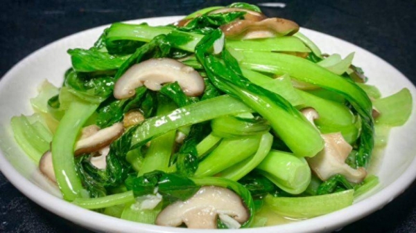 2、起锅油热后下入小白菜,蒜末,开大火快速的翻炒。调味加盐、鸡精,白糖,再把香菇加进来,开大火快速的翻炒,就可以了,香菇炒小白菜就做好了。