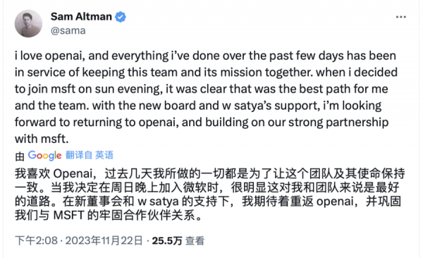 奥特曼随后发文称,自己深爱OpenAI,过去几天所做的一切都是为了让这个团队及其使命保持一致,"当我决定在周日晚上加入微软时,很明显这对我和团队来说是最好的选择。在新董事会和纳德拉的支持下,我期待着重返OpenAI,并巩固我们与微软的牢固合作伙伴关系。"