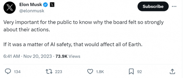 马斯克表示,研发先进人工智能技术的潜在危险非常高,作为目前世界上最强大的人工智能公司,OpenAI 应该解释其解雇奥特曼的原因。来源:海外社交平台截图