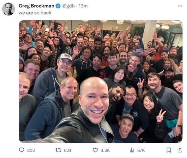 在当地时间将近凌晨两点时,兴奋的布洛克曼发布了一张和OpenAI员工们的合照:"我们终于回来了。"随后,OpenAI官方账号也转发了这张照片,配上了公司本次风波中最经典的一句话:"没有员工的OpenAI就什么也不是。"