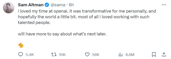 在被罢免后,奥特曼在X(原推特)平台上发文称:"我很喜欢在OpenAI的时光。这对我个人来说是变革性的,希望为世界也带来了一些变革。最重要的是,我喜欢与这些才华横溢的人一起工作。我将会宣布更多关于接下来的事情。"据外媒报道,为表达对奥特曼和布洛克曼的支持,当晚OpenAI有至少三名高级研究人员辞职。