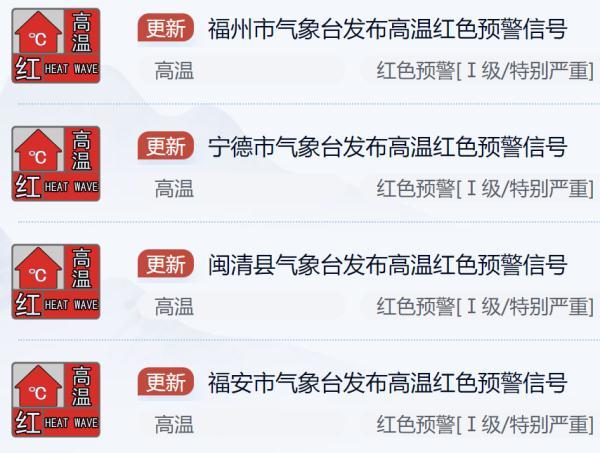 截至目前,福州市、宁德市、闽清县、福安市已发布高温红色预警。