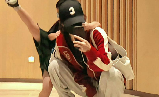 想想(赵丽颖儿子小名)趴在妈妈背后,俏皮地做出单脚飞踢的姿势。