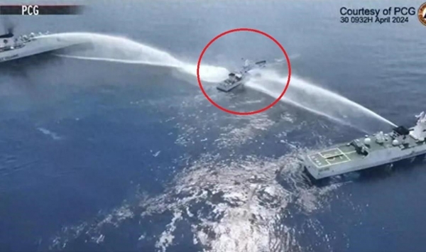 咱们海警部门的讲话是文质彬彬的,但从现场照片和视频来看,对抗还是非常激烈的。只见中方两艘庞大的海警船,将菲方一艘弱小的船只包夹在中间,对其进行了双向水炮暴击,打得菲船东倒西歪,摇摇欲坠,基本上将其"干废了"。这不是咱们吹牛,据菲律宾新闻局5月1日的报道,菲船遭到中方8次"定向高压水炮射击",3次"联合撞击",菲船外壳、电气、导航系统均不同程度受损。