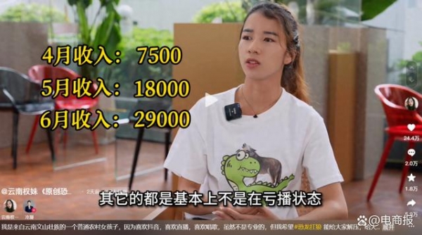 "云南权妹"曾在视频中透露她在直播中的收入:4月7500元,5月1.8万元,6月2.9万元。