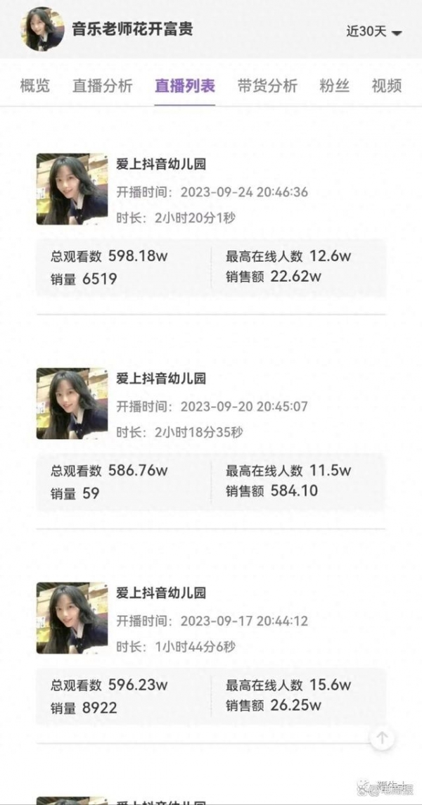 4月黄老师凭借一首儿歌火爆全网,5月粉丝量涨至500万,9月开启直播带货,粉丝量涨近800万。
