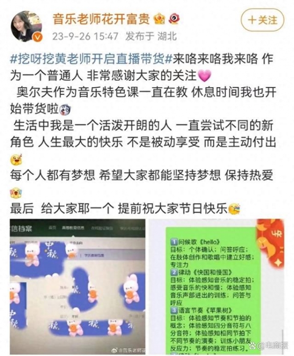 9月26日"挖呀挖黄老师开启直播带货"登上热搜后,黄老师也作了公开回应:音乐特色课一直在教,休息时间开始带货。