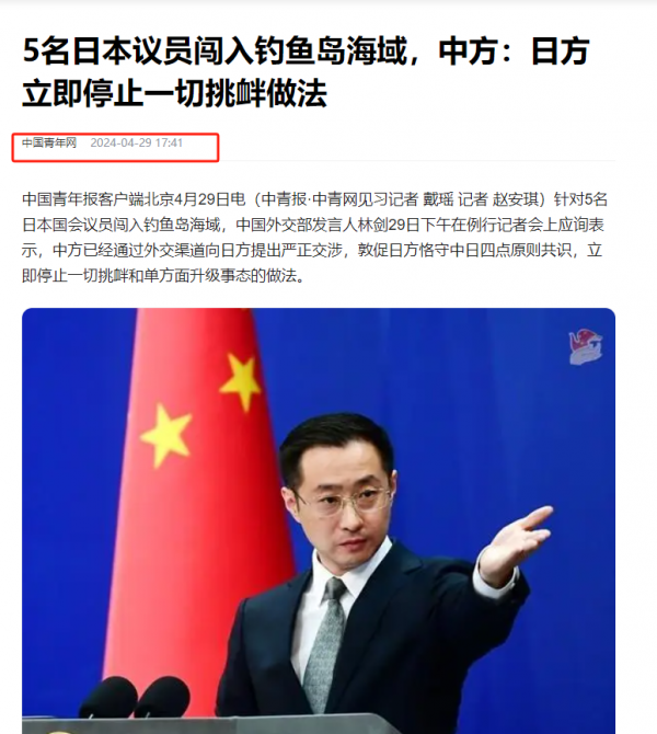 信源:中国青年网--5名日本议员闯入钓鱼岛海域,中方:日方立即停止一切挑衅做法
