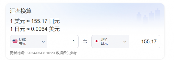 可面对美元的强势收割,日本政府的努力收效甚微,截止到2024年5月8日,日元和美元的汇率依旧保持在155:1的位置。