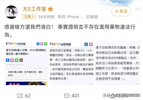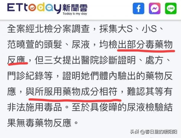 近日,大S工作室发文称:"感谢检方还我们清白。"原来是大小S尿检结果出炉了,虽然检查到了镇定药的成分,但跟门诊处方药成分相符。就连具俊晔的尿检结果也是阴性,完全跟黄子佼之前的指认相反,孰是孰非一时竟然难以分辨。