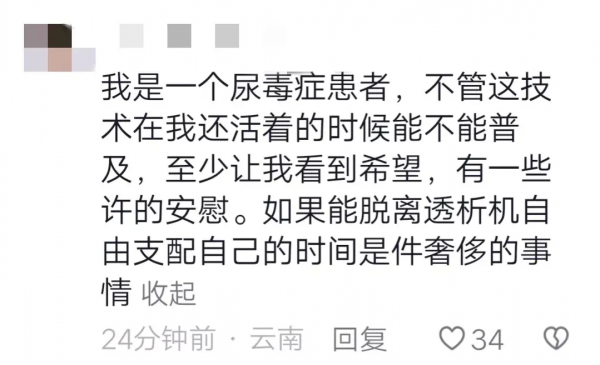 还有一位尿毒症患者网友说:"不管这技术在我还活着的时候能不能普及,至少让我看到了希望,给了我一些安慰。如果能脱离透析机,自由支配自己的时间,那将是一件多么奢侈的事情啊!"这句话真是说出了很多患者的心声,让人感慨不已。