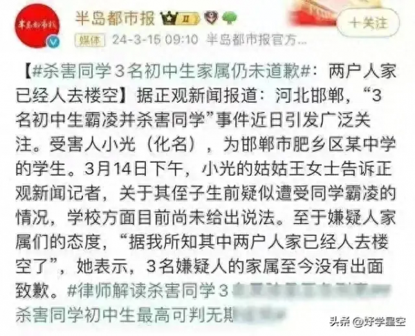 然而,正是这种轻视和忽视,让霸凌者更加肆无忌惮,也让受害者陷入无尽的痛苦和绝望。这次邯郸学生被杀案,就是校园霸凌问题长期得不到解决的一个极端例子。