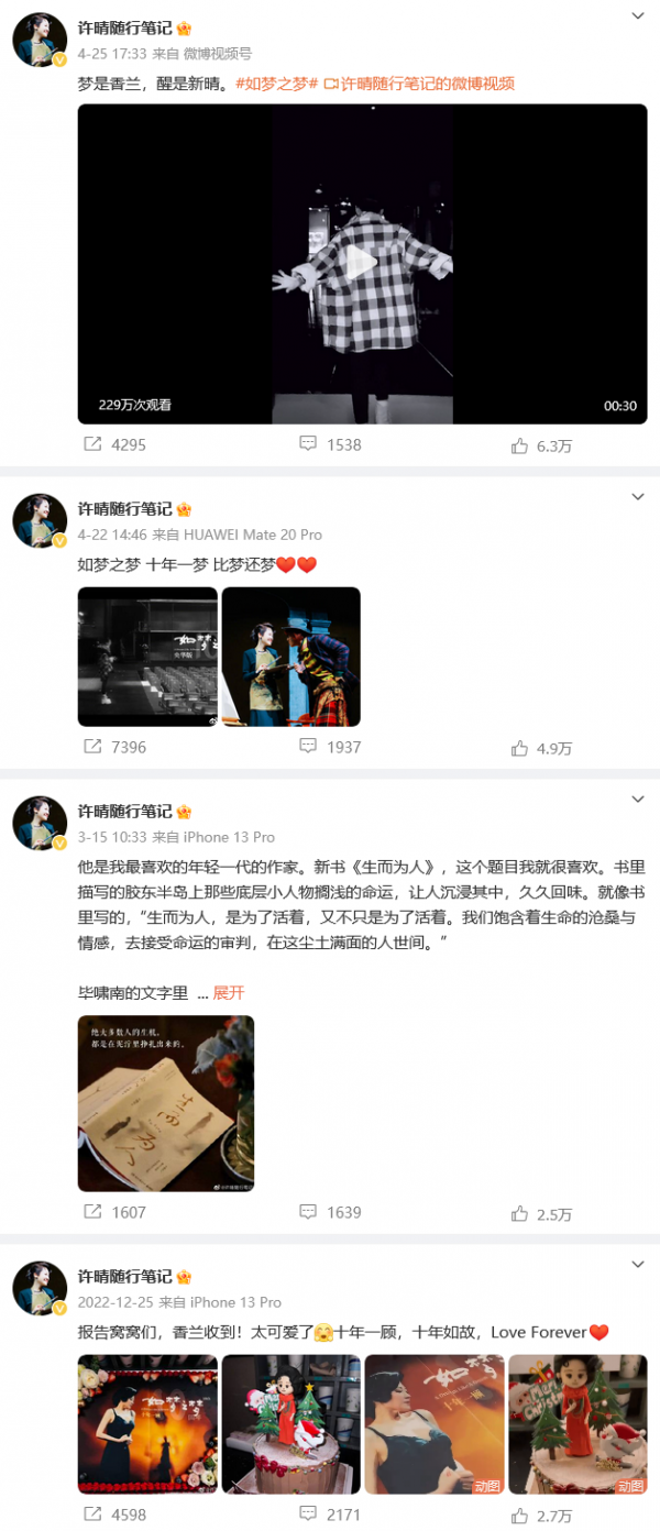 翻看其公开账号,鲜少更新动态,今年至今总计更新5条动态,大多是和话剧相关。