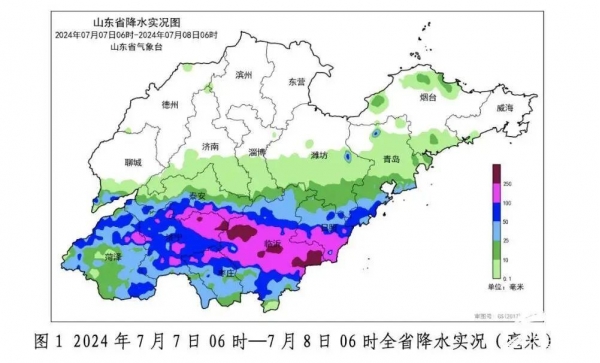 7日,临沂和济宁出现暴雨到大暴雨局部特大暴雨,聊城南部、菏泽、枣庄、日照、泰安南部和青岛南部出现大到暴雨局部大暴雨,济南南部、淄博南部、潍坊南部、青岛北部和烟台出现雷雨或阵雨;降水过程伴有明显短时强降水,最大小时雨强出现在临沂平邑葛针尧为101.3毫米,局部伴有7~8级雷雨阵风;半岛沿海地区及渤海海峡、黄海北部和中部的部分海区出现能见度低于500米的浓雾,局部能见度不足200米。