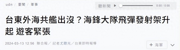 台湾中时新闻网称,除了台东地区外,近期台湾北部、南部及东部民众经常可见"海锋大队"的机动导弹发射车队频繁在各地海岸周围机动部署。台军方人士表示,这是为了因应解放军舰艇持续在台湾外围海域进行演训,以及舰载直升机自台湾东部海域舰上起降的威胁做出应对。"海锋导弹机动车队只要有解放军出没在台海周围,就会立刻前进滨海适当的战术位置进行机动部署。由于解放军持续侵扰,几乎时时刻刻都会出没,因此海锋大队与民众见面的机会大增。"