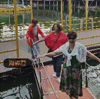 大妈们看中了一个横在水中的浮桥,这个浮桥看样子是连接旁边两个水上步道的通道,并不是游玩的地方。