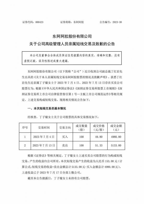 7月17日,东阿阿胶股份有限公司(证券代码:000423 证券简称:东阿阿胶)发布《关于公司高级管理人员亲属短线交易及致歉的公告》称,该公司副总裁丁红岩女儿丁子璇于2023年7月4日和7月13日存在买卖该公司股票的行为,且该买卖行为构成短线交易,产生的收益153元已于7月17日全部上缴公司。