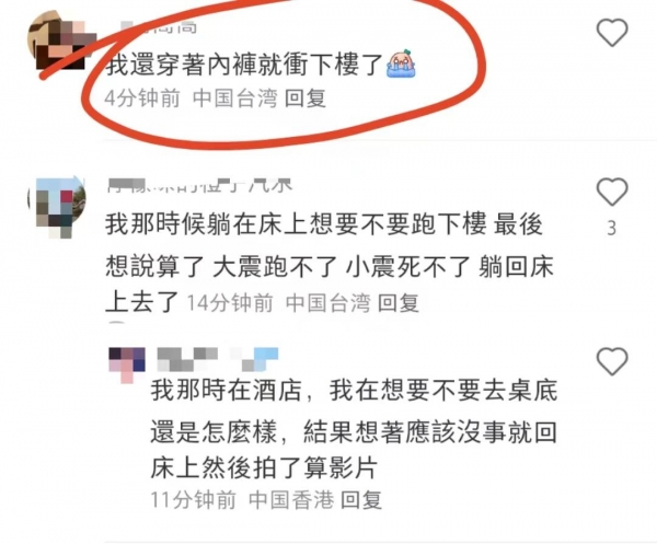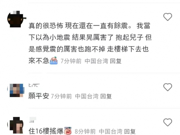 还有一位台湾同胞讲述,真的很恐怖,现在还在一直有余震,我当时以为是小地震,结果晃得太厉害了,抱起儿子就打算跑,但是后来感觉震的厉害也跑不掉,走楼梯下去也来不及……