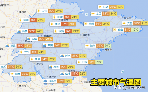 最高气温:菏泽、济宁、济南、淄博北部、谁坊北部和鲁西北地区35℃~37℃,南部沿海地区25℃~28°C,其他地区32℃~34°C。