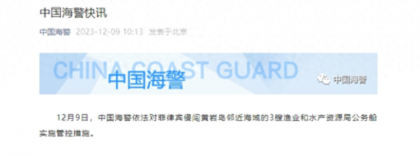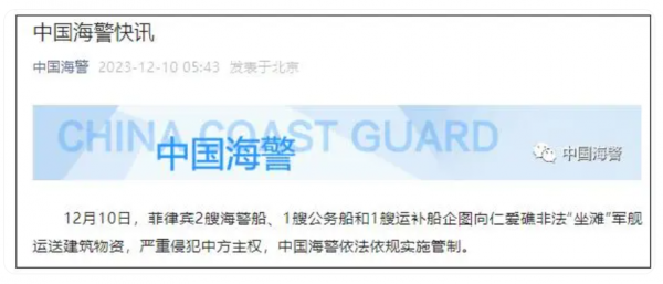 12.10--菲律宾又侵仁爱礁,菲律宾2艘海警船、1艘公务船和1艘运补船企图向仁爱礁非法"坐滩"军舰运送建筑物资,被中国海警依法依规实施管制。