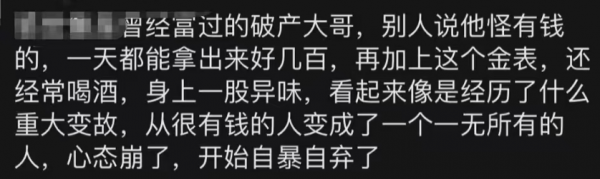 这男的以前很有钱,现在破产了,心态崩了,开始自暴自弃。这个爆料倒是有点根据,人在落魄后,往往出现"垂头丧气"的样子,而黑衣男子这么年轻就经历了人生的大起大落,一时难以接受,只能用"垂头丧气"来对抗自己当下无能为力的处境。