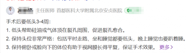 据首都医科大的医生说:低头帮助硅油或气体顶在裂孔周围,促进裂孔愈合。
