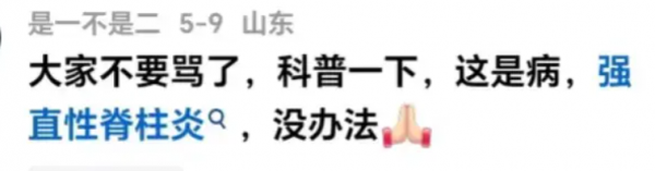 但从这张图看,他能抬起头来,并非网友猜测的"强直性脊柱炎"。