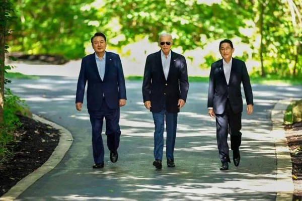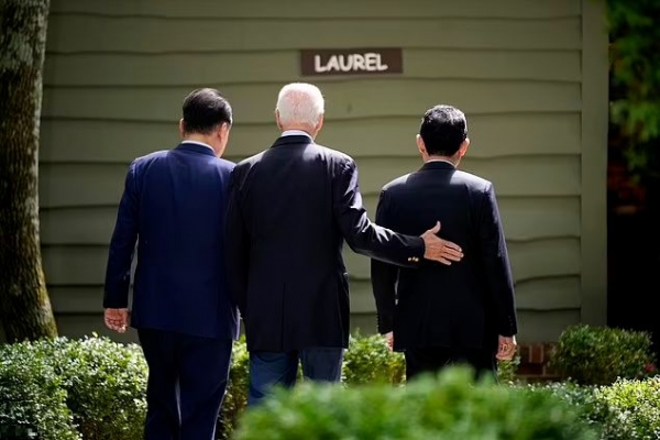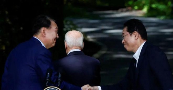 且不论他在此前的访问日本期间对着日本国旗鞠躬的镜头,至今被韩国国内许多人所记恨,单说在戴维营,无论是在拜登身前还是身后,尹锡悦与岸田文雄那叫一个热络。